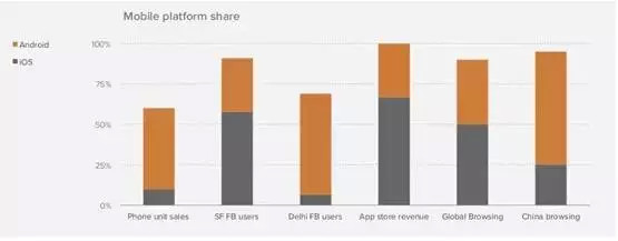 如上圖,全球銷量看,Android手機明顯多于蘋果;但Facebook舊金山用戶中,蘋果設備使用者多于Android,同時在雅加達,情況則反過來;另外,蘋果應用商店收入明顯高于Google Play;而以全球瀏覽器上網數據看,蘋果略高Android,但中國數據則完全相反,Android明顯多于蘋果。