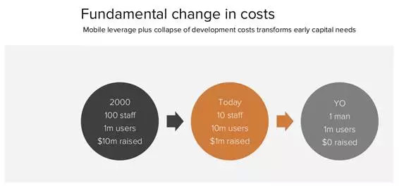 “杠桿效應”還改變了互聯網初創企業對早期資本的需求:2000年,一個融資 1000萬美金、擁有100名員工的初創企業能吸引100萬用戶;現在,融資100萬美元,有10個員工的公司就能吸引1000萬用戶;而未來憑借移動互聯網,一人白手起家,不要拿什么投資,就能吸引100萬用戶。
