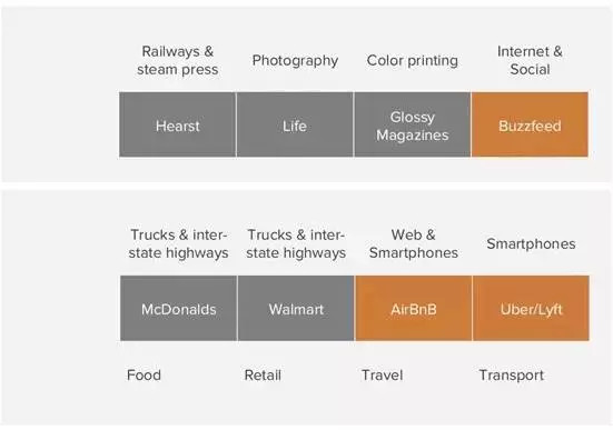 2.通常跟技術相關公司分三種。一是以技術為核心的公司,如蘋果;二是通過技術改進產品或擴展業務,但技術不是核心,如亞馬遜;三是被新技術催生出的公司,可能做的是傳統行業,但都基于新技術,如Airbnb。而如果重點關注第三種公司,我們會發現:每波技術創新浪潮,都會催生一些新行業,比如: