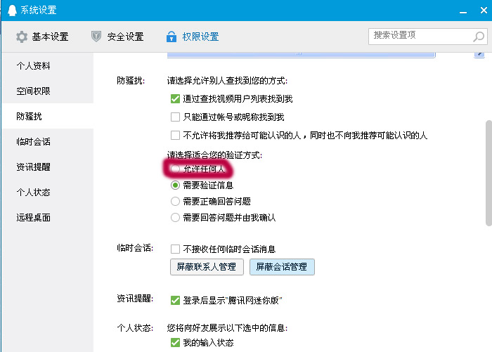 1、登錄QQ—系統(tǒng)設(shè)置——權(quán)限設(shè)置,如下圖: