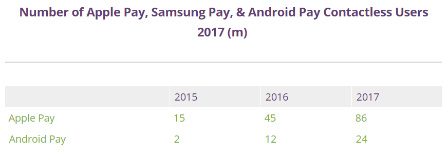 根據Junpier Research的一封報告顯示,蘋果支付和安卓支付的用戶數將在年末分別達到 8600 萬和 2400 萬。