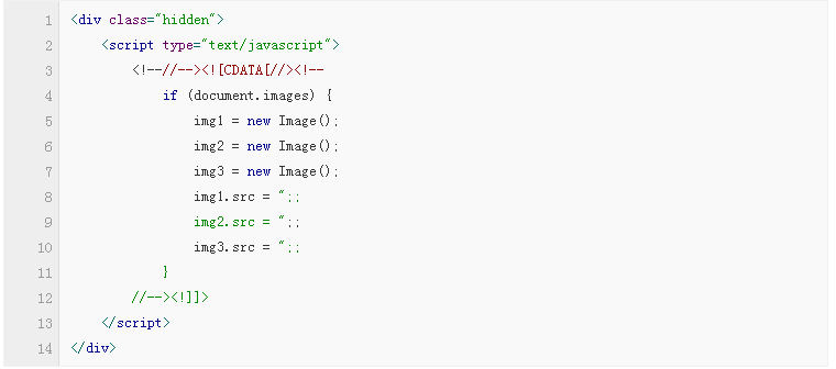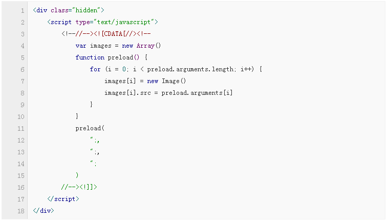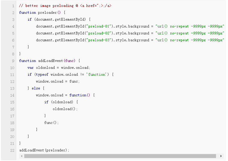該方法雖然高效,但仍有改進余地。使用該法加載的圖片會同頁面的其他內容一起加載,增加了頁面的整體加載時間。為了解決這個問題,我們增加了一些JavaScript代碼,來推遲預加載的時間,直到頁面加載完畢。代碼如下: