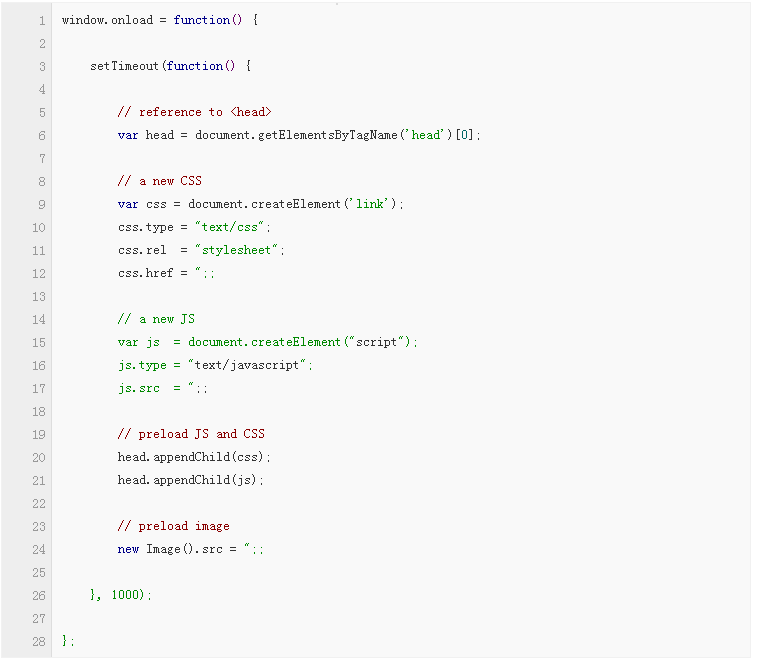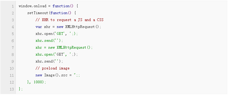 上面代碼預加載了“preload.js”、“preload.css”和“preload.png”。1000毫秒的超時是為了防止腳本掛起,而導致正常頁面出現功能問題。