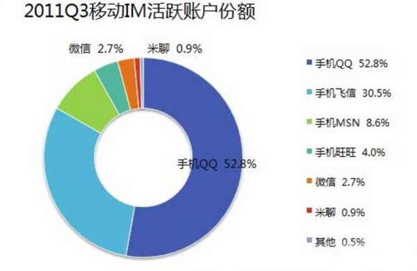 這是2011年第三季度移動應用市場份額圖,當時騰訊的微信、小米的米聊才剛剛推出,而飛信經過四年的跑馬圈地,已經占據了幾乎三分之一的市場,排在它前面的只有手機QQ,這兩家占據了超過八成的市場份額,當時微信和米聊跟它都不是一個量級,而電信的易信要再等兩年才會出現。事實上,這也是飛信所能達到的極限了,因為中國移動內部一直對飛信采取打壓發展的策略,畢竟短信電話賺錢太容易,何必費勁搞個吃力不討好的飛信?所以飛信雖然是移動的嫡長子,其實是個庶出的命。更重要的一點,中國移動也搞不清楚飛信以后要怎么發展,所以前期一直沒有對電信和聯通的用戶開放,大大錯失了一統天下的好機會,好比項羽在鴻門宴時放走了劉邦,等回過頭來的時候,就只有自刎烏江了。