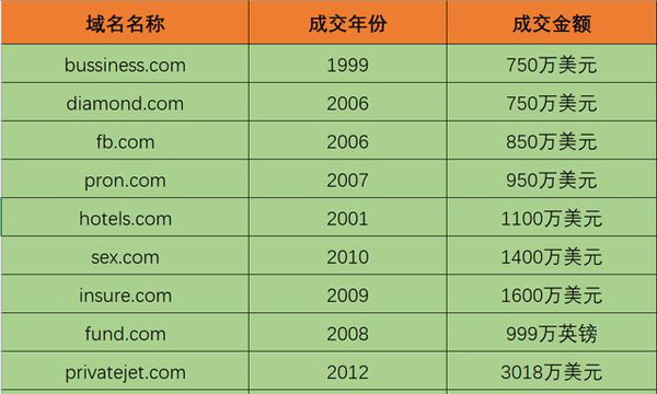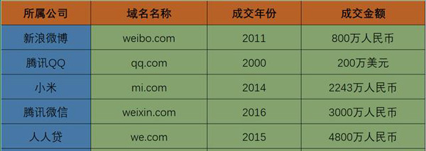 2000年,騰訊QQ為了擁有qq.com的域名,花費(fèi)了200萬美元;2011年,新浪微博為了獲得weibo.com的域名所有權(quán),也付出了800萬人民幣;2014年,小米也是花了2243萬人民幣才購買到mi.com的域名;2015年,人人貸為了we.com的域名更是花了4880萬的天價(jià)。同年還有360公司更為為了獲得360.com的域名,出了1億人民幣的天價(jià)!加上2016年,騰訊微信為了購買weixin.com,都提出了訴訟仲裁,幾經(jīng)周折還是付出了3000萬人民幣的代價(jià)。此外還有國外互聯(lián)網(wǎng)公司的購買案例,我就不一一列舉了,直接看下圖吧:
