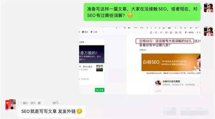 為什么為有這個認(rèn)為呢,因為我除了自己公眾號、博客以及自媒體發(fā)布后,受一些第三方知名媒體轉(zhuǎn)載,所以每天都有5-10人加過來。之前有個人加過來問我,說白楊老師,你收徒弟嗎,跟你學(xué)會SEO是不是就可以賺錢了?我回復(fù)說,一則我不再網(wǎng)上收徒,二則SEO學(xué)會了不等于賺錢,我也不會賺錢,怎么教你賺錢呢?