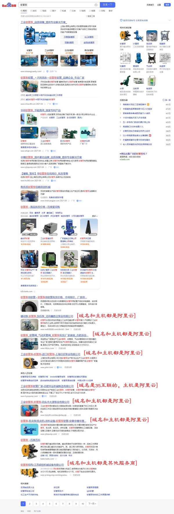 從上圖我們可以看到百度“軟管泵”這個詞,自然排名首頁的7家公司,有6家用的都是阿里云產(chǎn)品(其中只有一家域名是35互聯(lián)的)。當然,我們不能說用了阿里的產(chǎn)品就能做好關(guān)鍵詞排名,小編只是想說關(guān)于域名和主機這塊阿里云還是相對最穩(wěn)定的,當然價格也是最高的。一般企業(yè)網(wǎng)站想購買比官網(wǎng)價格低的產(chǎn)品可電話咨詢:15339698279(何經(jīng)理)。