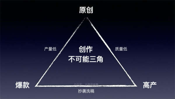 比如任何一個(gè)行業(yè)、垂類能講出花樣的內(nèi)容或選題,可能就那么多,總有消耗完的一天,創(chuàng)作者不得不“借鑒”其它爆款。即使你真的高產(chǎn)如母豬(背后有幾百人的智囊團(tuán)隊(duì)),但,你能保證每一個(gè)作品都能成為爆款嗎?這就是內(nèi)容創(chuàng)作的一個(gè)不可能三角模型:原創(chuàng)、爆款、高產(chǎn)。