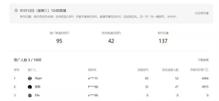 去年12月,視頻號(hào)上線了直播預(yù)約推廣功能,一場直播可以綁定 1000 個(gè)推廣人。簡單來說,用戶可以通過掃碼綁定成為直播推廣人,在視頻號(hào)后臺(tái)也可以直接查看一場直播中,推廣人帶來的預(yù)約觀眾數(shù)、受邀人在直播間的交易金額。