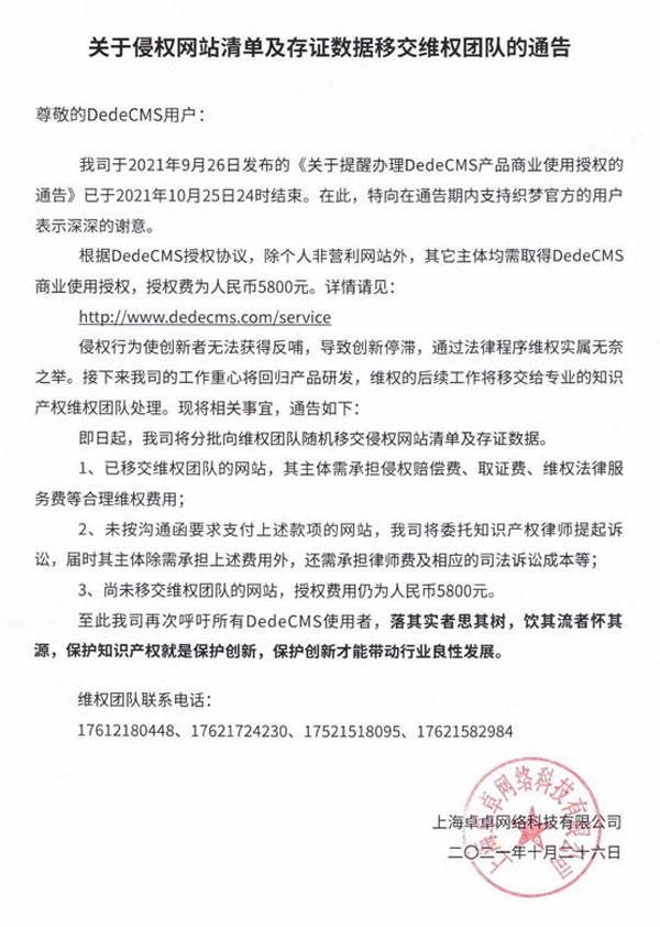 10月26日,織夢CMS發布侵權網站清單及維權公告,開始落實之前的侵權工作。