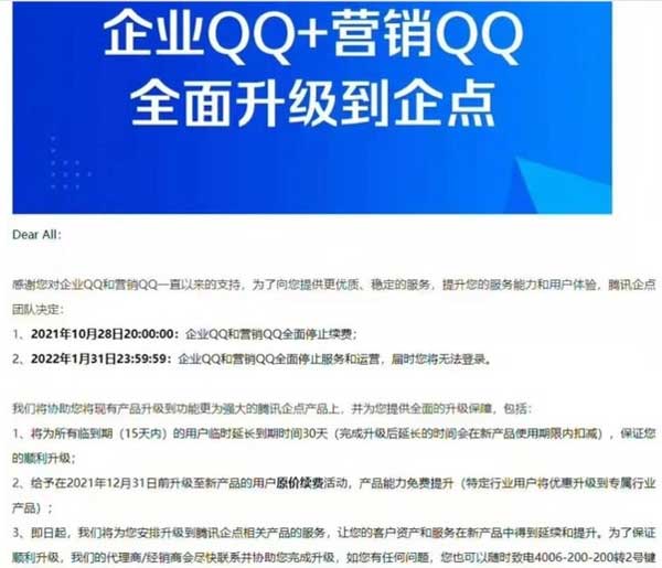 據悉,企業QQ和營銷QQ是由騰訊公司為中小企業搭建的企業級溝通平臺。為了提供更優質、穩定的服務,提升服務能力和用戶體驗,企業QQ將升級至騰訊企點。