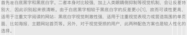 然而Hill(1997)的研究卻表明:黑色和白色一直被認為是最可讀的;有黑色在內的色彩組合比沒有黑色的色彩組合更易于閱讀;較淺背景上較深的文本比較暗的背景上較淺的文本的評價高。因此,更好的組合可能是保證了對比度(大于4.5)的淺灰背景 + 深灰文本。