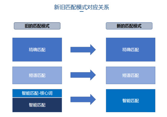 升級(jí)前的匹配模式為:精確匹配,短語匹配,智能匹配-核心詞,智能匹配;