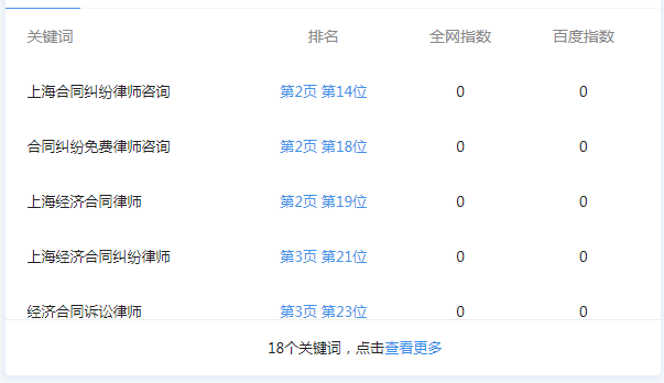 網站上線2個月,網站關鍵詞:上海經濟律師,上海合同糾紛律師,上海借款糾紛律師,上海經濟合同律師,上海合同訴訟律師,上海經濟訴訟律師......排名百度前三首頁。新站上線三個月的考察期馬上就要走完了,非常期待后期的排名!