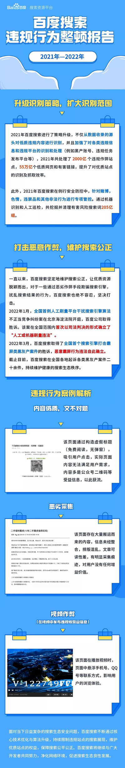 2022年4月14日21:45分,百度搜索資源平臺在其微信公眾號上發布了一條信息:2021年百度搜索違規行為整頓報告。通過這份報告來看,百度的打擊力度非常大,可以說用“有點嚇人”來形容,不過改消息在發布幾小時后被刪除。但還是有眼尖的網友保留了原文截圖。