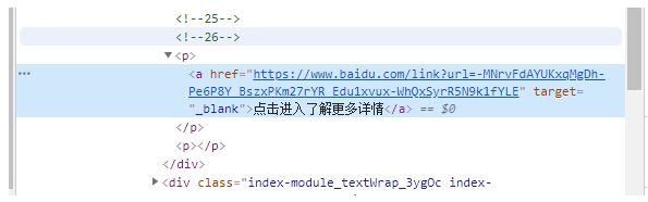 通過上圖我們可以看到,這是百家號的一篇文章,但在文章的首行和文章的最底部,赫然出了一行插連接的字“點擊進入了解更多詳情”。點開鏈接后,直接跳轉到了第三方公司的官網。而通過源代碼查看,該URL已經被被加密了,是link\URL通過加密鏈接跳轉到公司官方了。