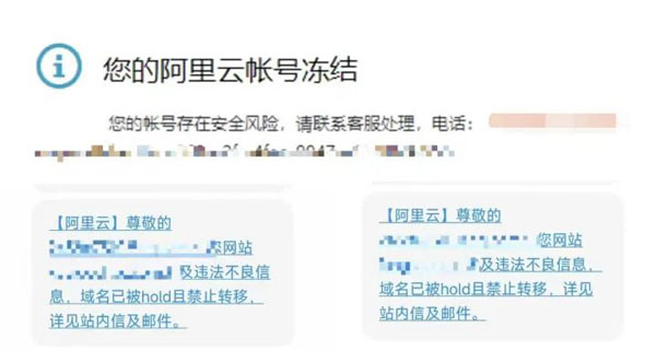某網(wǎng)友爆料:一個(gè)站長(zhǎng)有60多個(gè)客戶站,說(shuō)沒(méi)就沒(méi)了,損失慘重。60個(gè)域名,全部被禁止解析和轉(zhuǎn)移、而且阿里云帳號(hào)被凍結(jié),其中一個(gè)域名指向網(wǎng)站涉詐。