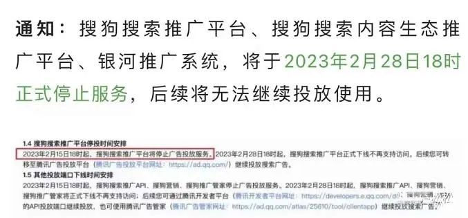 2023年2月15日18時起,搜狗搜索推廣 平臺將停止廣告投放服務。2023年2月28日18時起,搜狗搜索推廣 平臺正式下線不再支持訪問。