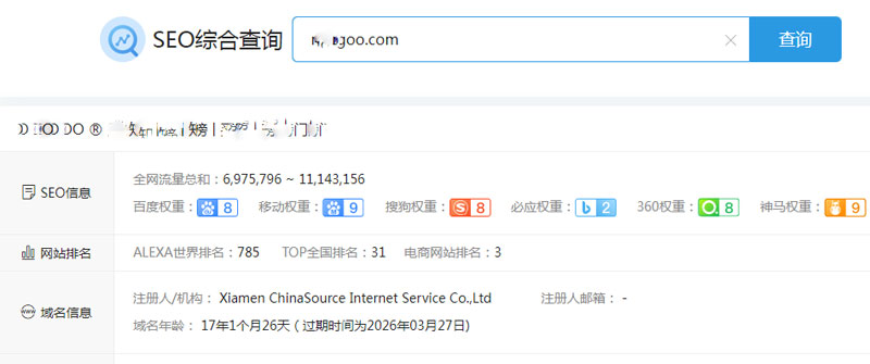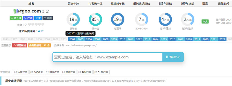 雖然域名質量看起來不好,但人家收錄量確實是高。目前百度收錄1億左右!市面上的域名很多,往往建站之前,就得通過查看域名的建站歷史、外鏈、歷史快照等,看看域名是否存在被污染的情況。個人推薦用:桔子SEO 。
