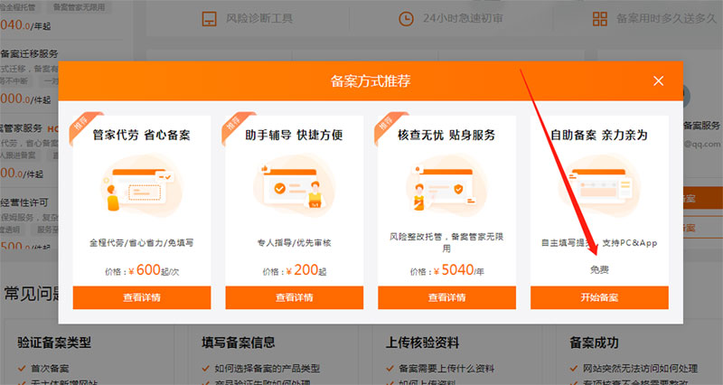 然后會彈出一個備案方式推薦讓你選,直接就選如下圖的最后一個免費,點擊開始備案按鈕。(如果選其他的就是付費讓阿里幫你備案,例如第一個專人聯系全程幫你提交資料,服務費用是600元,第二個選項就是只是指導你怎樣操作但也要200元,第三個就純粹是一個坑了5040元/年,如果你看了我這篇文章就為您省下這些備案的服務費了)