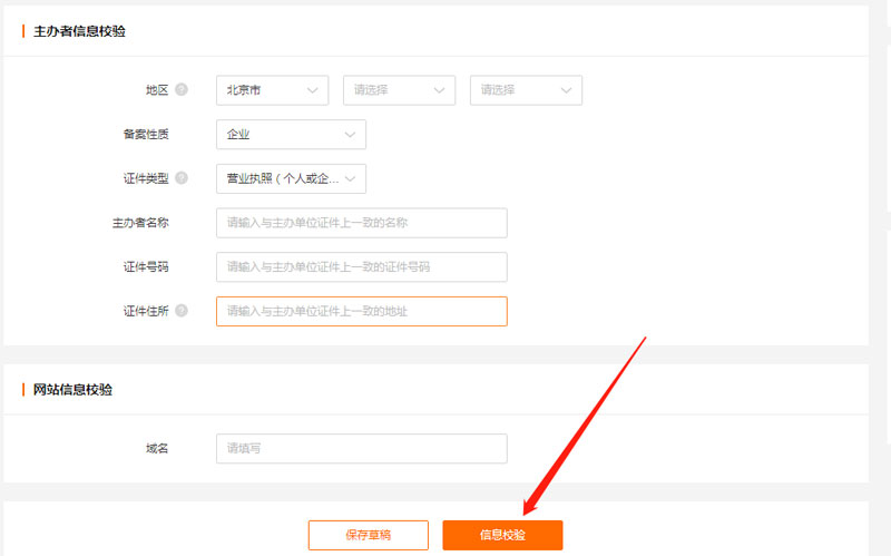 下一步就是填寫備案的基礎信息了,如公司名稱,證件號碼等,填完信息后點信息校驗,如下圖: