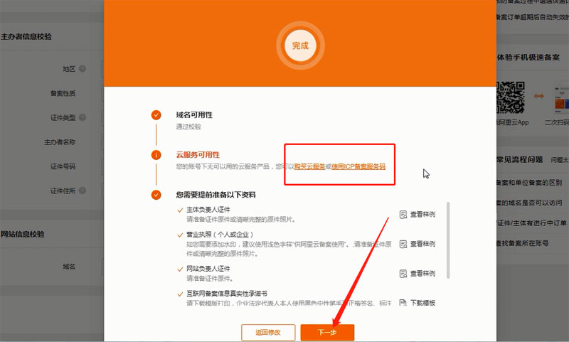 信息校驗通過后會彈出如下圖(注意下圖我用紅色框住的地方:你可以購買阿里云服務或使用ICP備案服務碼。購買阿里云服務意思是你可以通過購買阿里云的服務器或者虛擬主機等來進行備案,你也可以通過填入ICP備案服務碼來進行備案):