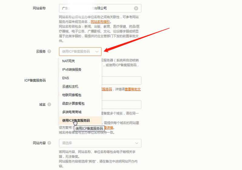 下一步填寫網站備案信息,如下圖(云服務如果你購買了云虛擬主機的,那就直接選云虛擬主機,如果你購買的是阿里云服務器那就選使用ICP備案服務碼,如果你的ICP備案服務碼用完了可以加下方微信咨詢購買備案碼。)