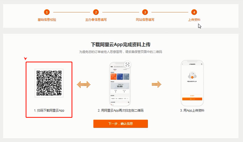 然后下一步就到上傳資料,如下圖:(這一步需要用手機掃碼下載阿里云的app,安裝后登陸上傳營業執照、身份證等資料,然后掃臉認證才可以完成上傳,資料上傳完后點下一步確認信息)