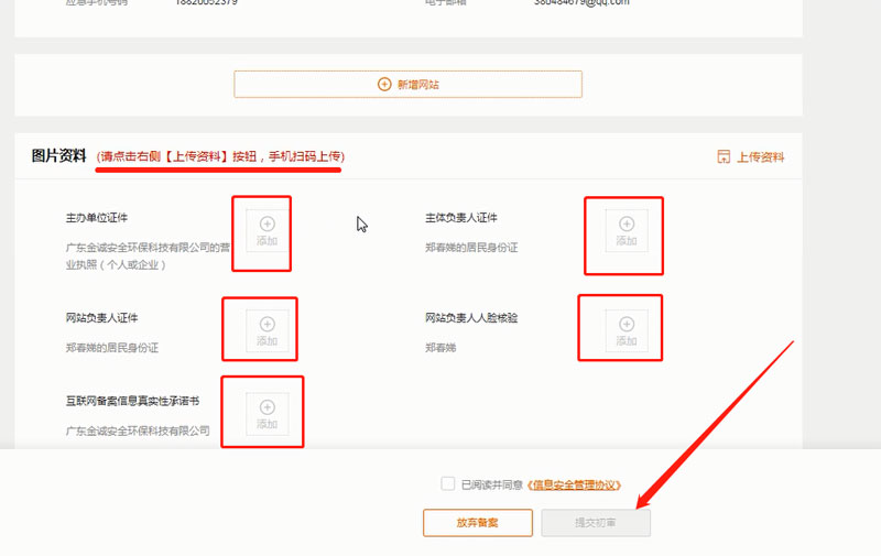 當上面的資料都上傳完了點了下一步則進入如下圖(在下圖中你上傳了資料會顯示在出來,然后在以閱讀同意處打鉤,點擊提交初審就可以了。到此網站的備案信息就完成提交了,等審核就可以了)