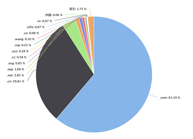 域名的后綴非常多,有.com、.cn、.net等等,每個域名的受歡迎程度不不一樣,通過已備案網站的數據得到以下結果: