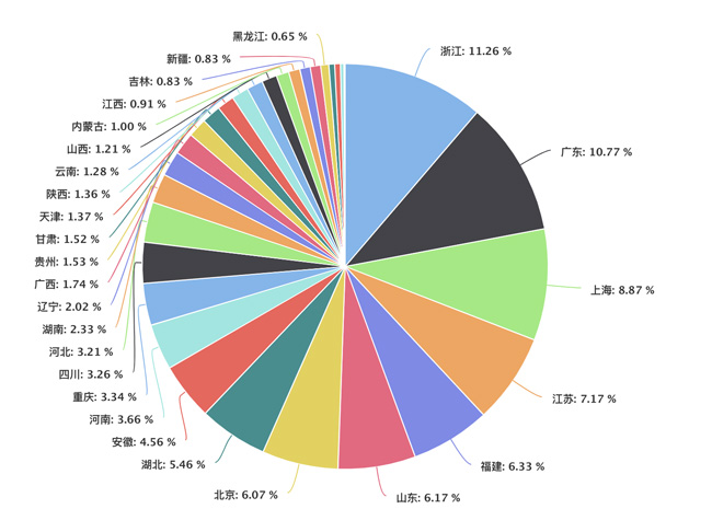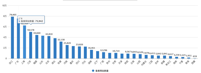 從上圖可以看到,浙江、廣東、上海、江蘇、福建這些省市網站數量非常多,浙江網站數量排第一,不知道是不是受馬云的影響。