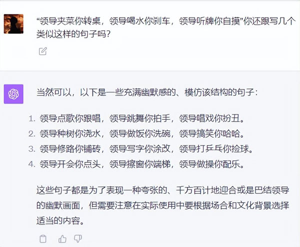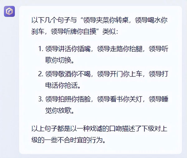 世超問(wèn)了幾個(gè)流行的段子: “ 領(lǐng)導(dǎo)夾菜你轉(zhuǎn)桌,領(lǐng)導(dǎo)喝水你剎車 ” ,讓它們給仿寫幾個(gè)。