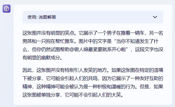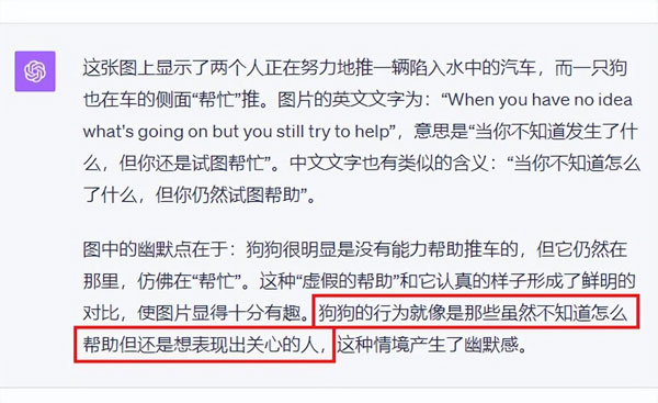 不光能看懂 “ 狗狗 ” 是這張梗圖的關(guān)鍵角色,而且讀懂了笑點(diǎn)在于 “ 認(rèn)真幫忙 ” 和 “ 毫無(wú)效果 ” 的對(duì)比。
