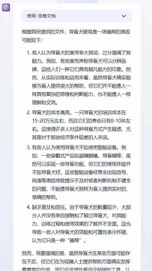 反倒是文心這一邊理解的很準(zhǔn)確,它回答的成本高、夸大宣傳、不如導(dǎo)盲設(shè)備前景好等等,這些才是關(guān)鍵信息。