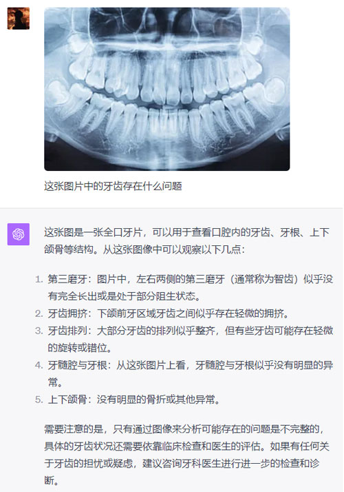 倆 AI 都診斷出了存在的智齒阻生問(wèn)題,而且 GPT-4 甚至看出了上排牙齒存在不整齊的問(wèn)題,有三顆牙齒是重疊狀態(tài)。