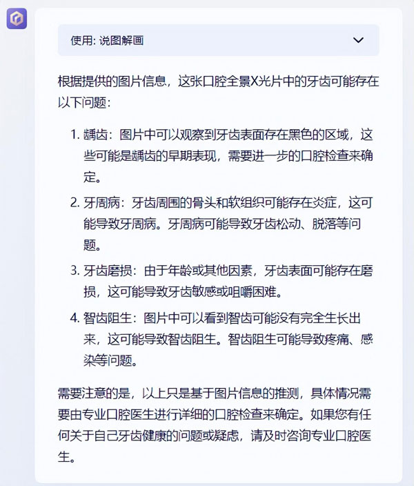 雖然文心一言也發(fā)現(xiàn)了智齒阻生的問(wèn)題,也指出了可能存在的其他問(wèn)題。但還是 GPT-4 的答案更準(zhǔn)確,更貼切。