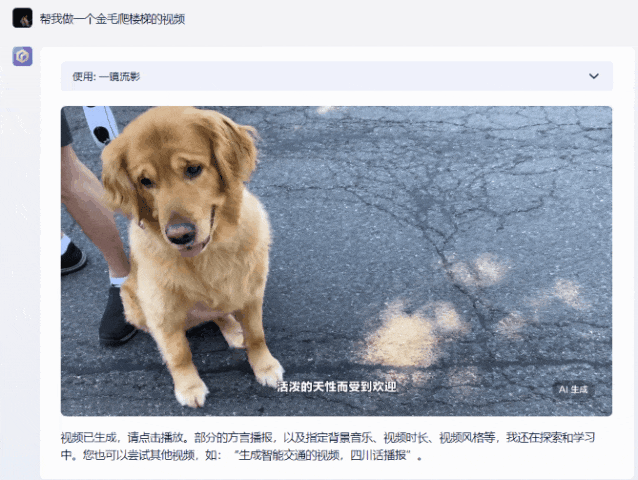 比如說(shuō)一句話做一個(gè)金毛爬樓梯的視頻,幾分鐘之后一條配好音的視頻就做好了。