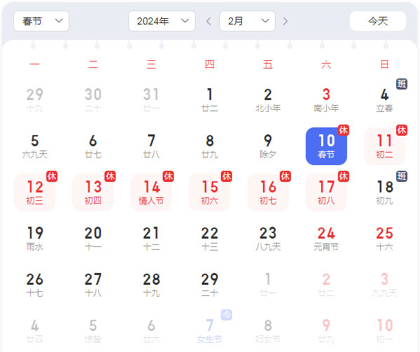 2024年2月6日(農(nóng)歷臘月二十七)至2024年2月17日(農(nóng)歷正月初八),共十二天,2024年2月18日(農(nóng)歷正月初九)正式上班。