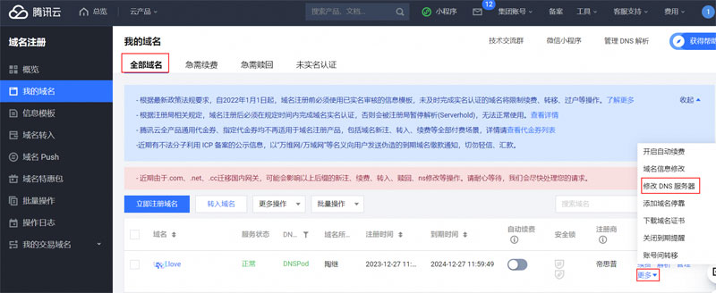 1、登錄 DNSPod 域名注冊控制臺,在 全部域名 頁簽下單擊目標域名后方的 更多 按鈕, 選擇 修改 DNS 服務器 。