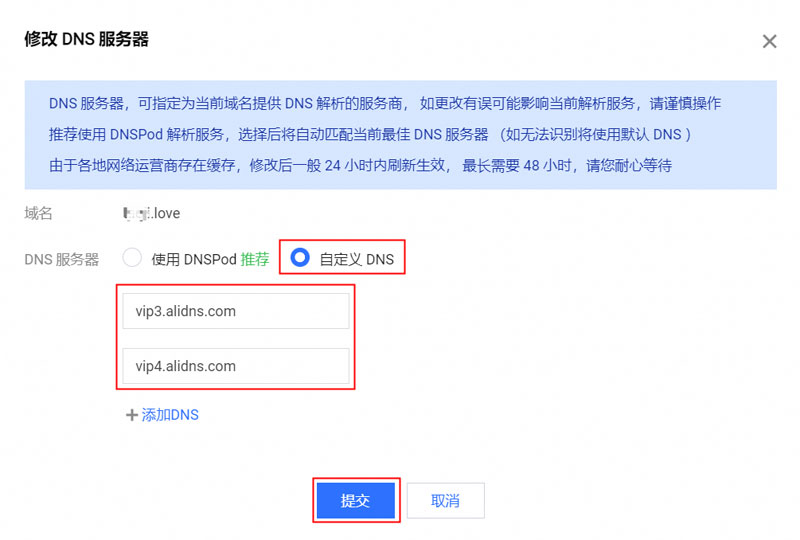 2、在 修改DNS服務器 彈框中選擇 自定義DNS ,輸入阿里云解析系統分配的DNS服務器名稱,然后單擊 提交 按鈕完成設置。